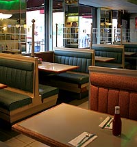 You might think you were in a diner in Anywhere, USA, at least until the waitress with dreadlocks and a nose ring saunters over to take your order, a reminder that you are smack in the middle of Chelsea, not off the interstate highway in New Jersey. The Formica tabletops, the familiar counter in the front with two-day-old cakes and pies tucked behind the glass bakery showcase, the peeling aqua vinyl seats, all this could be plunked down in any town with similar effect. The food is reassuringly familiar—waffles with beautiful fresh berries, fresh and generously sized salads, fat burgers piled high with lettuce, tomatoes and onions—and the menu typically expansive. Looking for 15 different varieties of chicken? They're here, and that's just the hot entrees. Also on offer are chicken salad, sandwiches, chicken finger appetizers, and more. They also serve 20 variations on the classic burger, including the Canadian buffalo bison, and a different omelette filling for each day of the month. The Rail Line Diner (which was formerly called Moonstruck Diner, but was independently owned and not affiliated with the other NY-area diners bearing the same name) has all the standards and then some—without stretching too far out of the comfort zone.