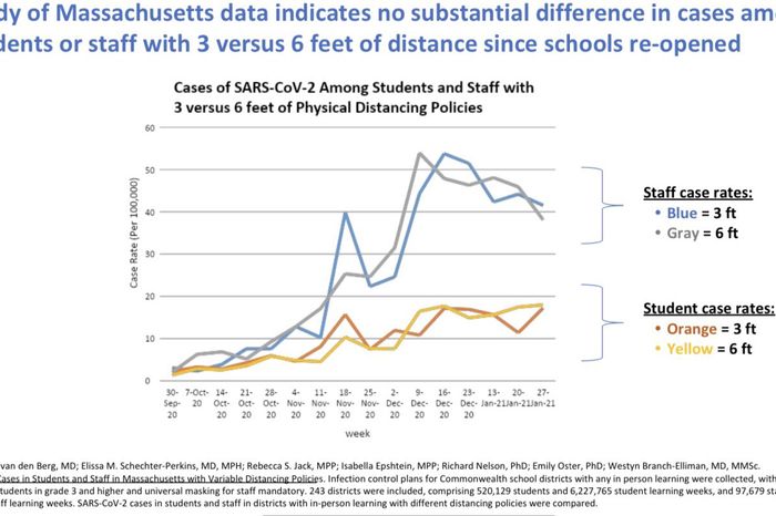For some time, the recommendation, and resulting dispute, on distancing in schools has been based on conjecture from indirect evidence from past studies. Last week, however, a study on this exact point was presented by Commissioner Riley in Massachusetts. They study was based on direct data from September through January, comprising more than 520,000 students and nearly 100,000 staff in 243 school districts across the state. The conclusion: There is no substantial difference in cases among students or staff with three feet versus six feet of distance.